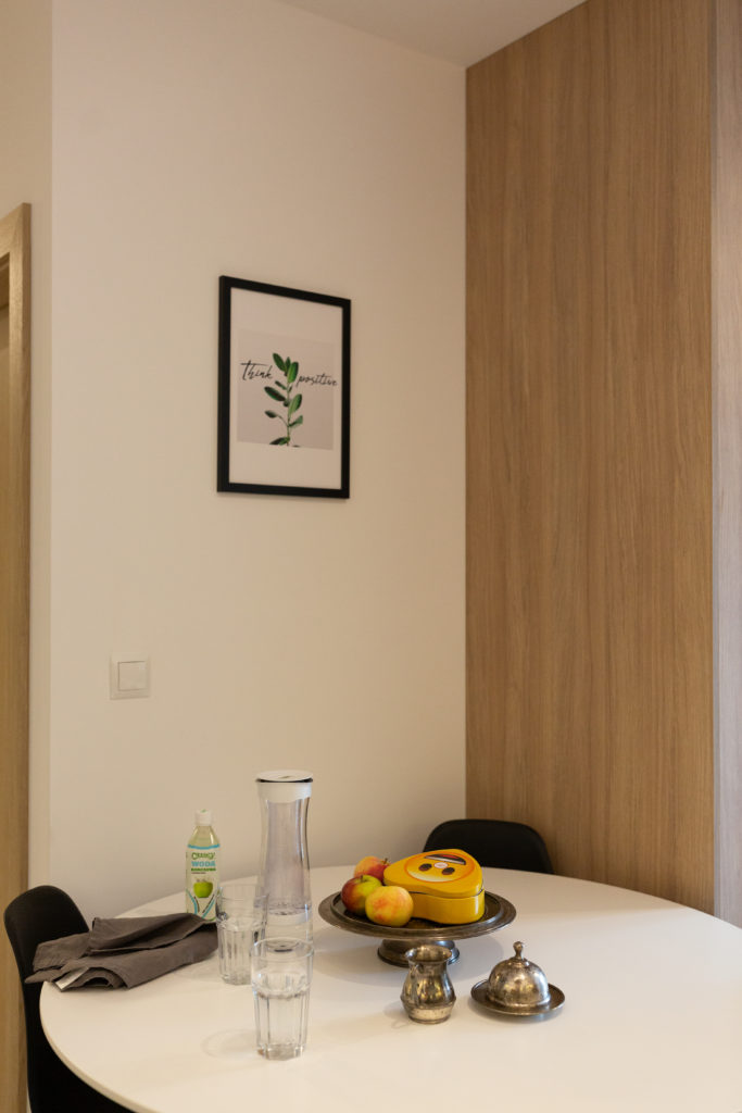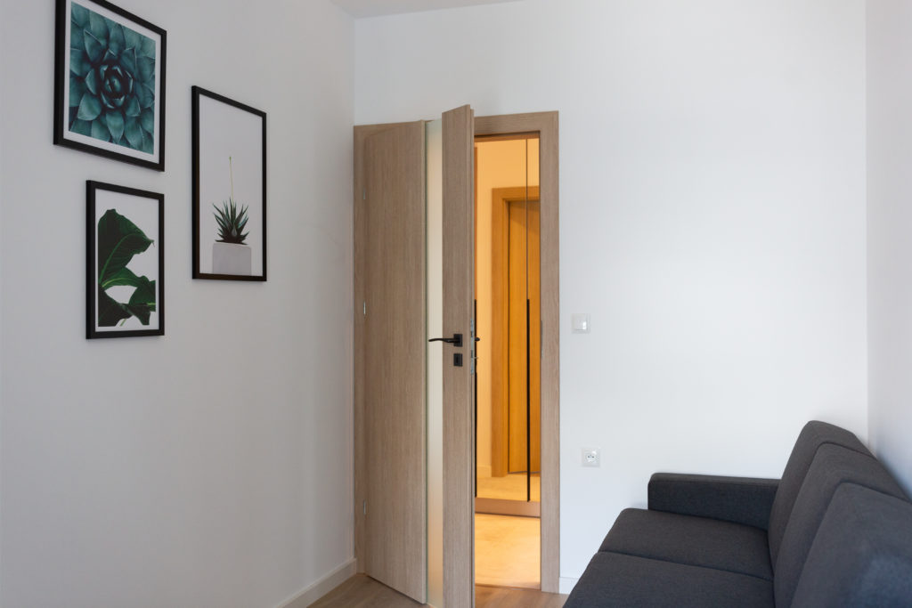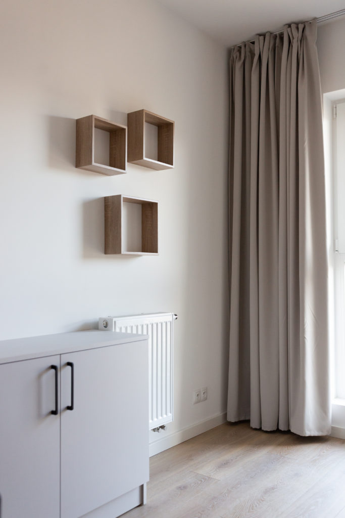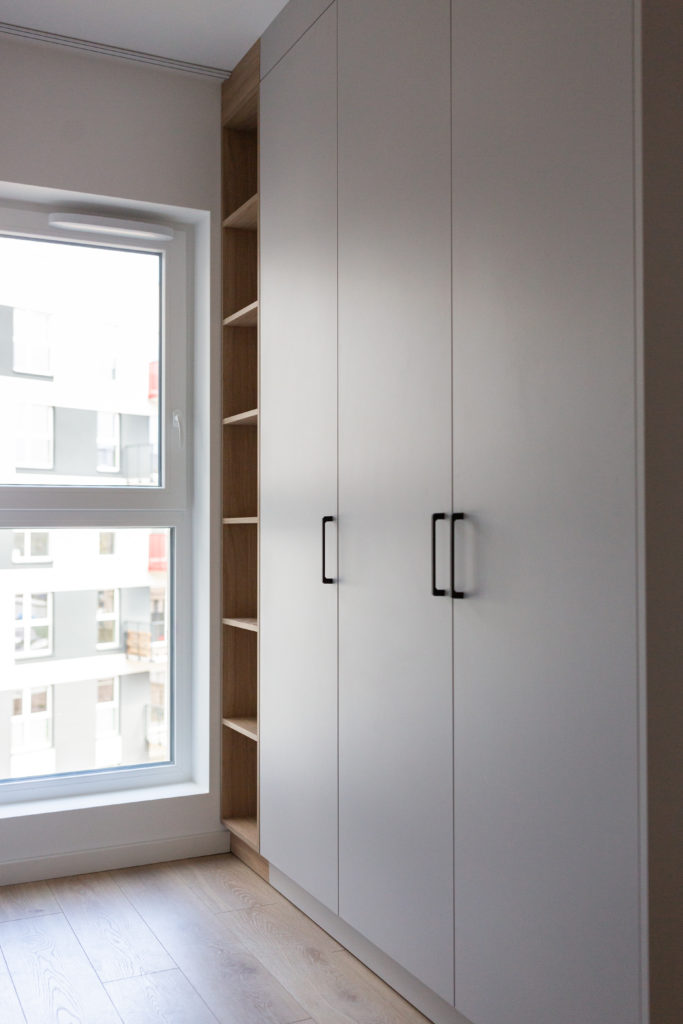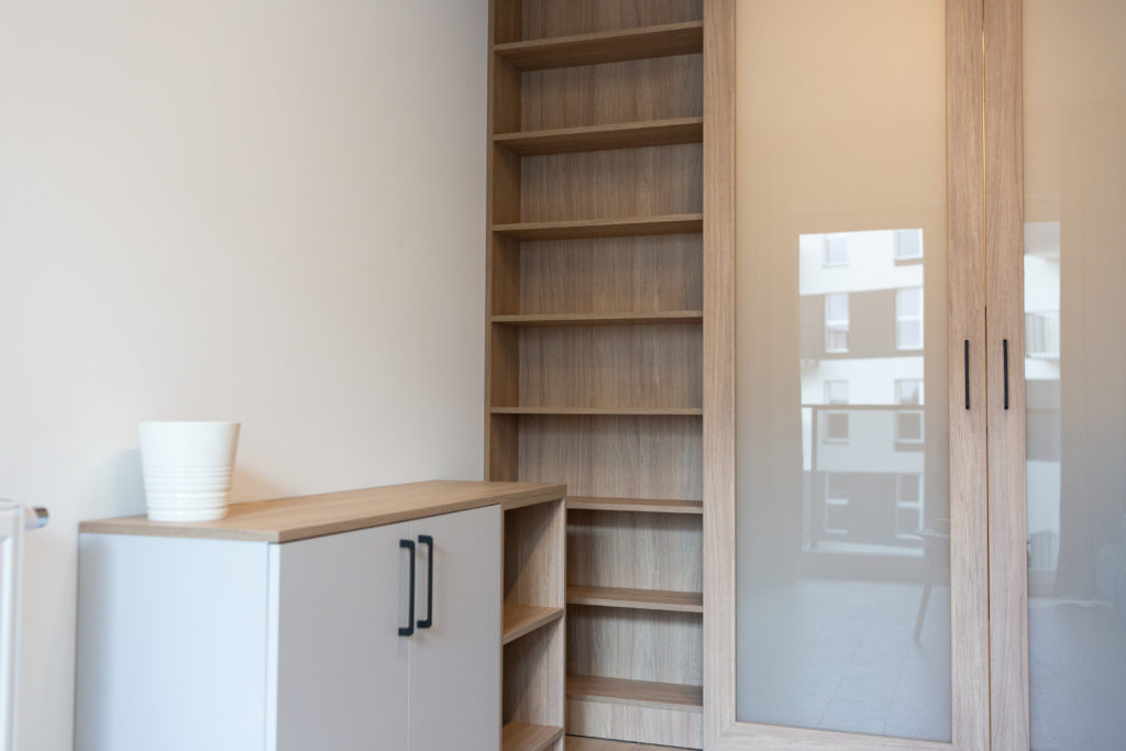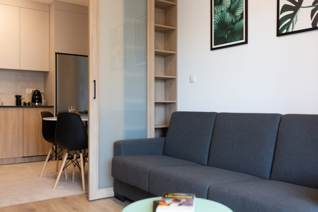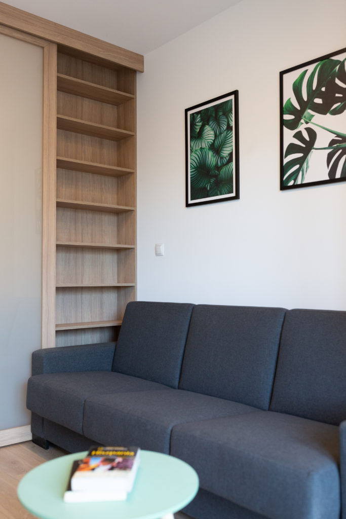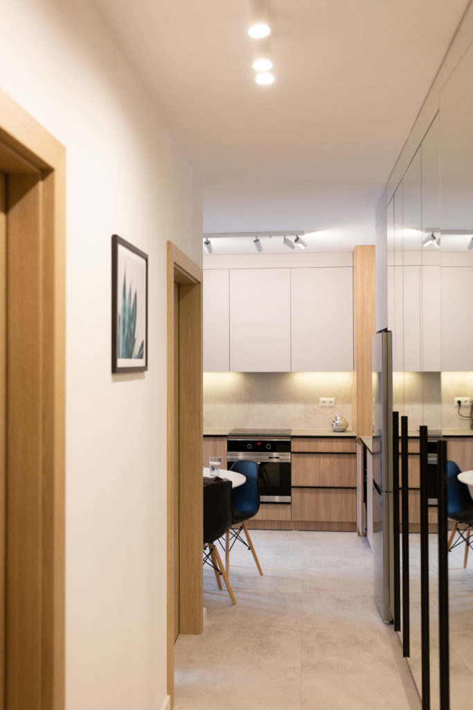 Kolejna realizacja mieszkania na wynajem. Zaprojektowaliśmy jasne, nowoczesne wnętrza. Zadbaliśmy o odpowiednią przestrzeń dla każdego i wygodę użytkowania. Kluczem do sukcesu w przypadku tej aranżacji jest oryginalna zabudowa meblowa, w tym przesuwne drzwi między kuchnią a salonem.