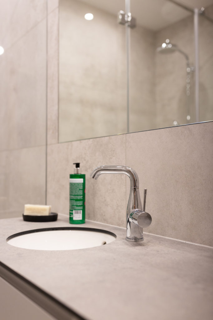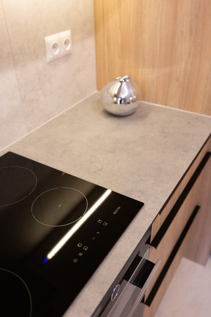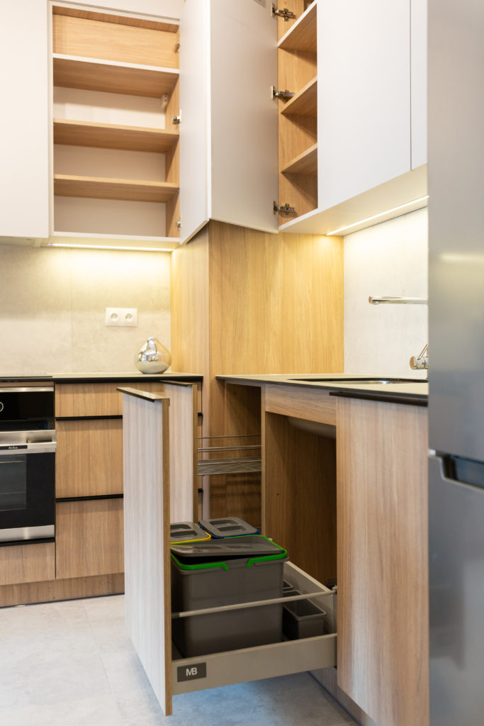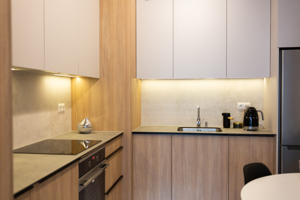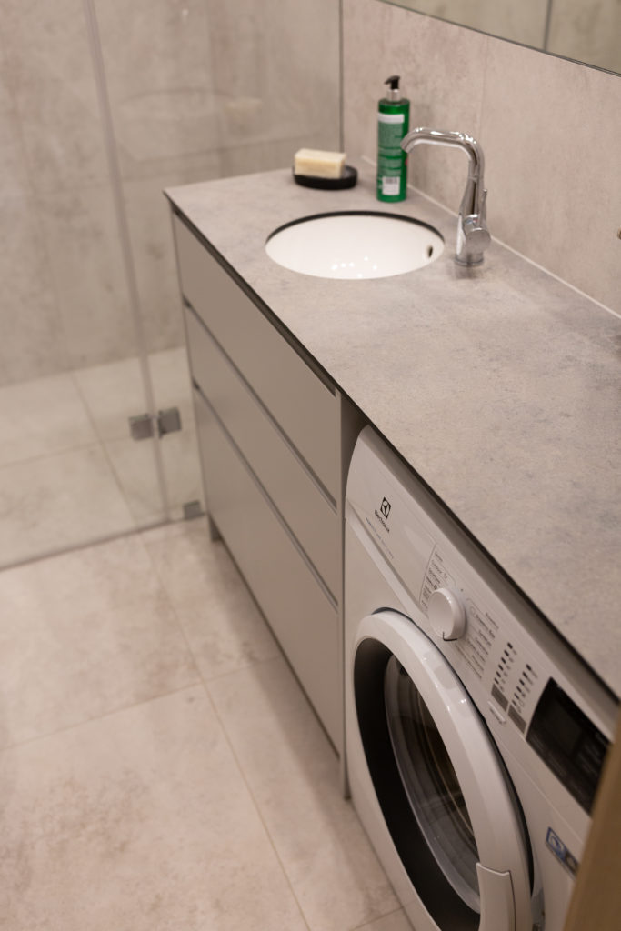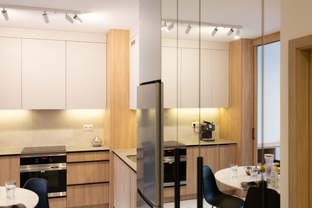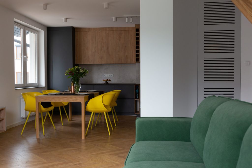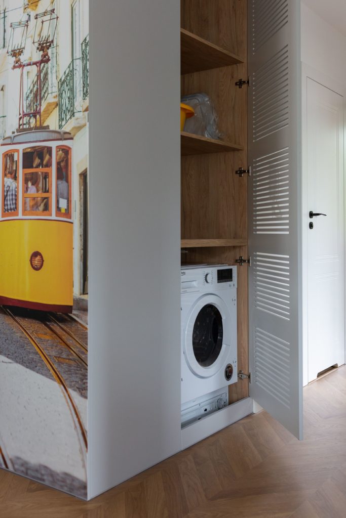 Kolejna realizacja mieszkania na wynajem. Zaprojektowaliśmy jasne, nowoczesne wnętrza. Zadbaliśmy o odpowiednią przestrzeń dla każdego i wygodę użytkowania. Kluczem do sukcesu w przypadku tej aranżacji jest oryginalna zabudowa meblowa, w tym przesuwne drzwi między kuchnią a salonem.