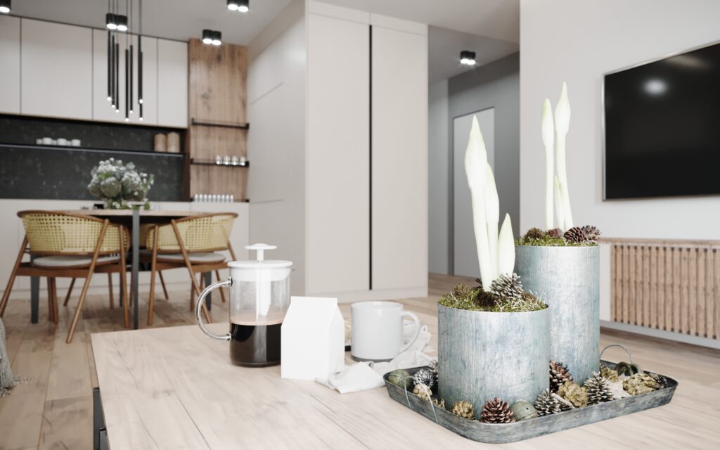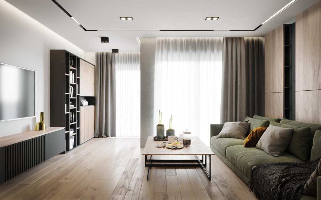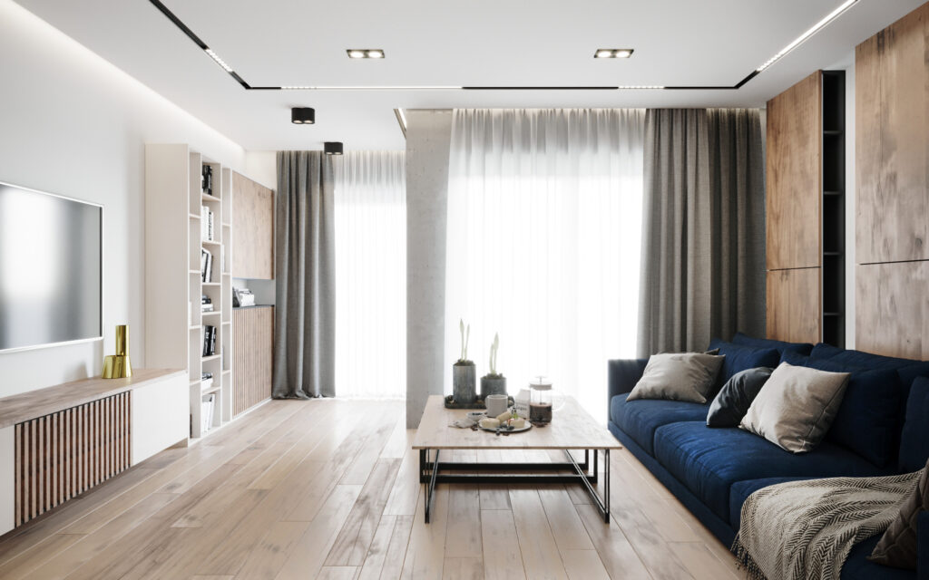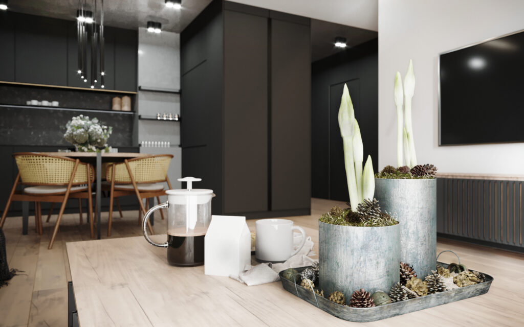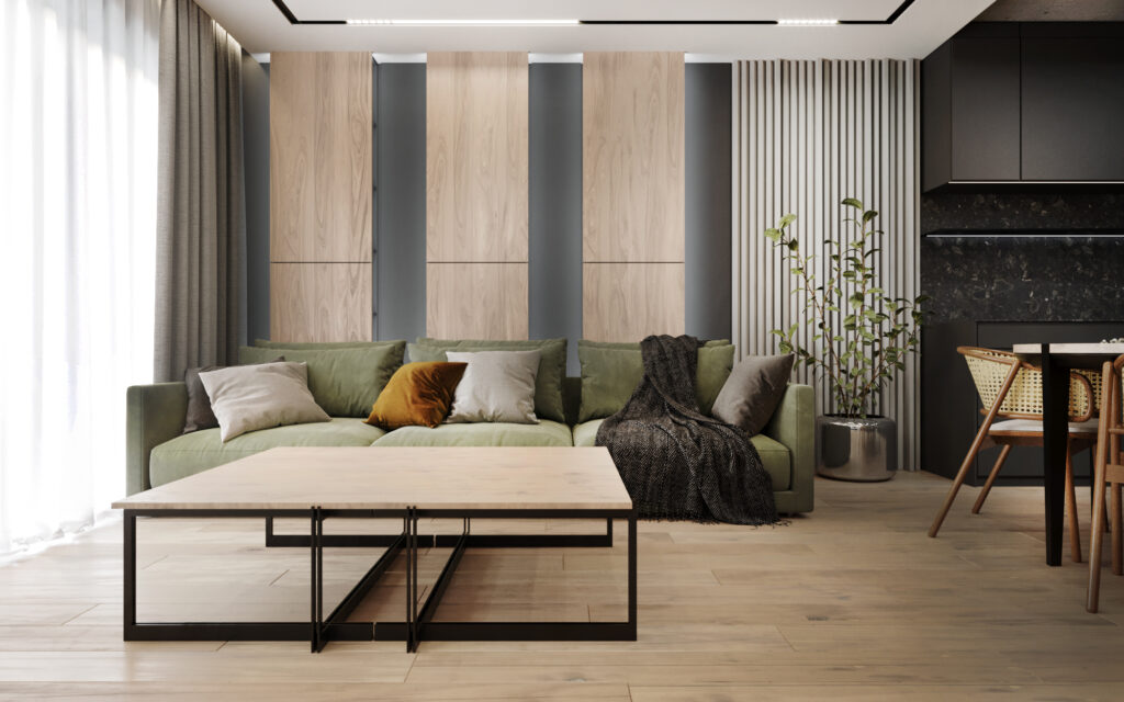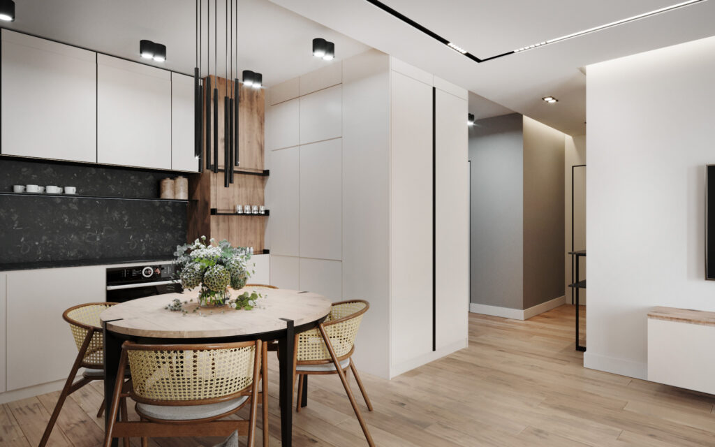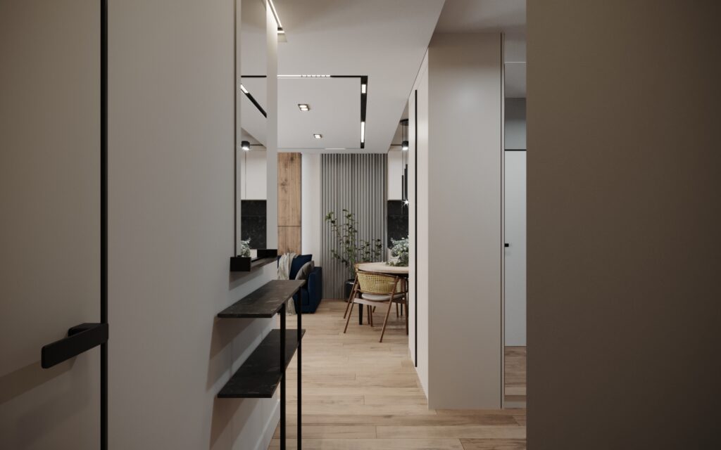 Na życzenie klienta przygotowaliśmy wizualizację tego mieszkania w dwóch wersjach: ciemnej i jasnej. W obu odmianach to nowoczesne wnętrza o wyrazistym charakterze. Zastosowanie wysokiej jakości materiałów, w tym naturalnego drewna i forniru, podkreśla wyjątkowość aranżacji.