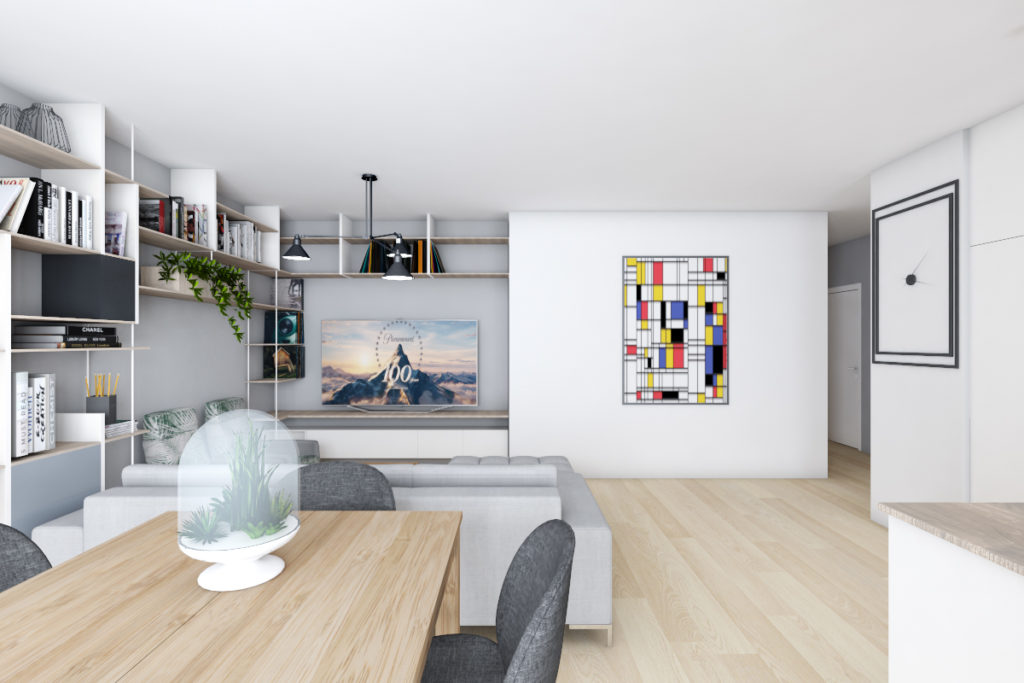 Nasz projekt 76 m2 mieszkania nad Wisłą. Jasne, nowoczesne wnętrze urzeka swoją prostotą i wygodą, a jednocześnie intryguje ciekawymi rozwiązaniami i detalami. Najciekawszym elementem jest łazienka, inspirowana obrazem Pieta Mondriana.
