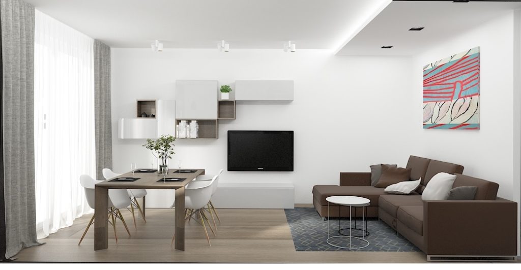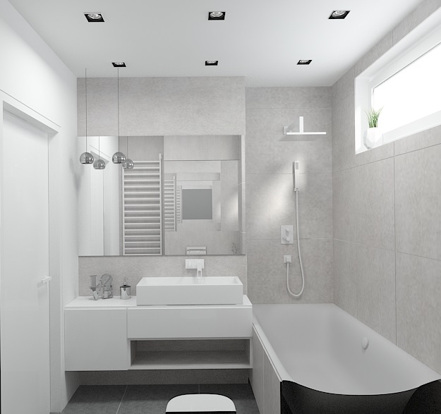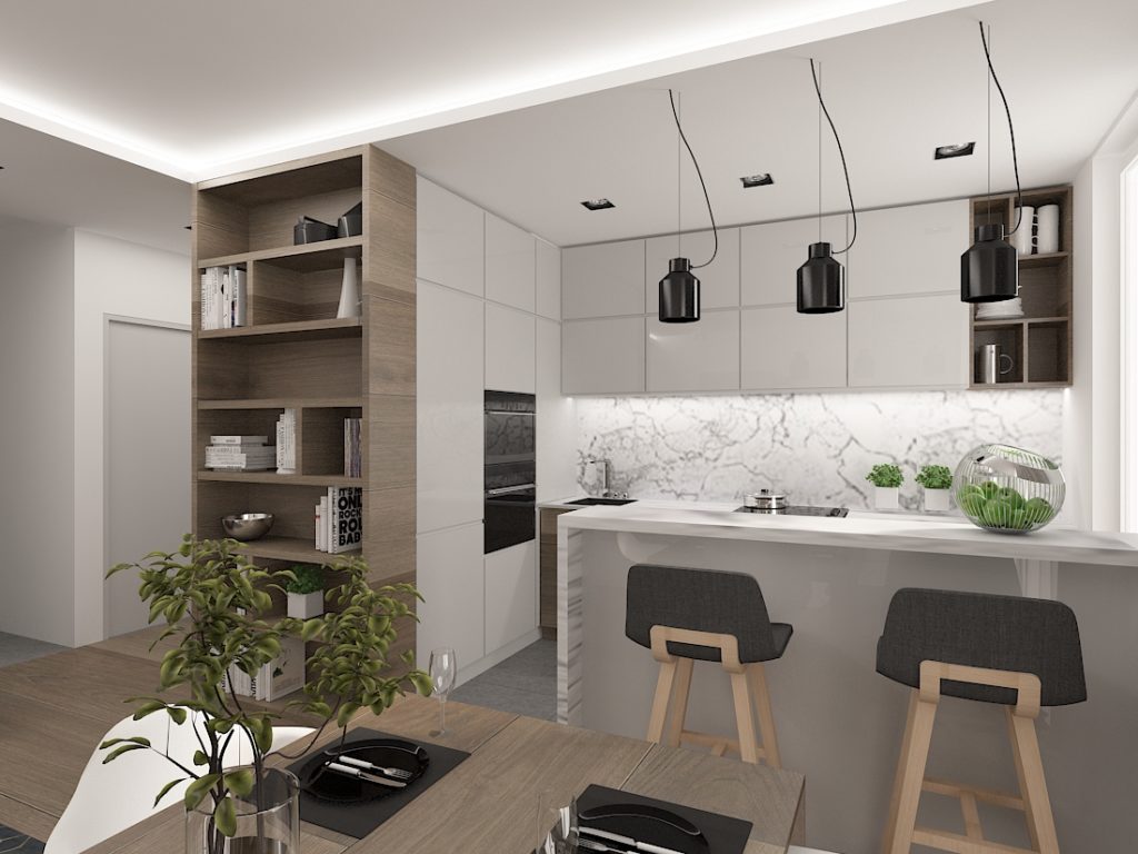 Przygotowana przez nas wizualizacja projektu mieszkania na krakowskim osiedlu Bagry Park. Prezentujemy różne ujęcia salonu z aneksem kuchennym i meblami na wymiar oraz kilka wersji łazienki.