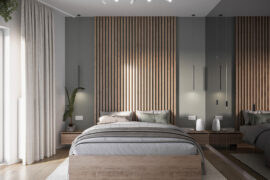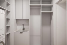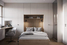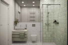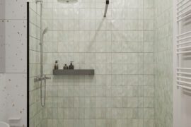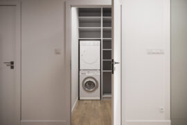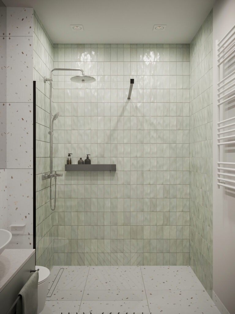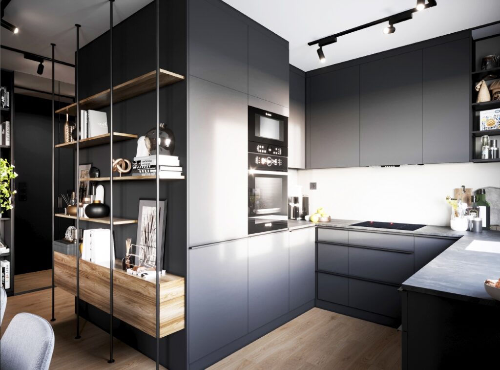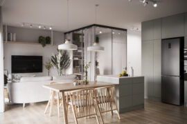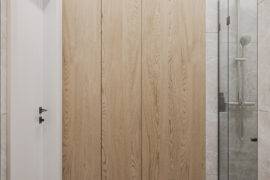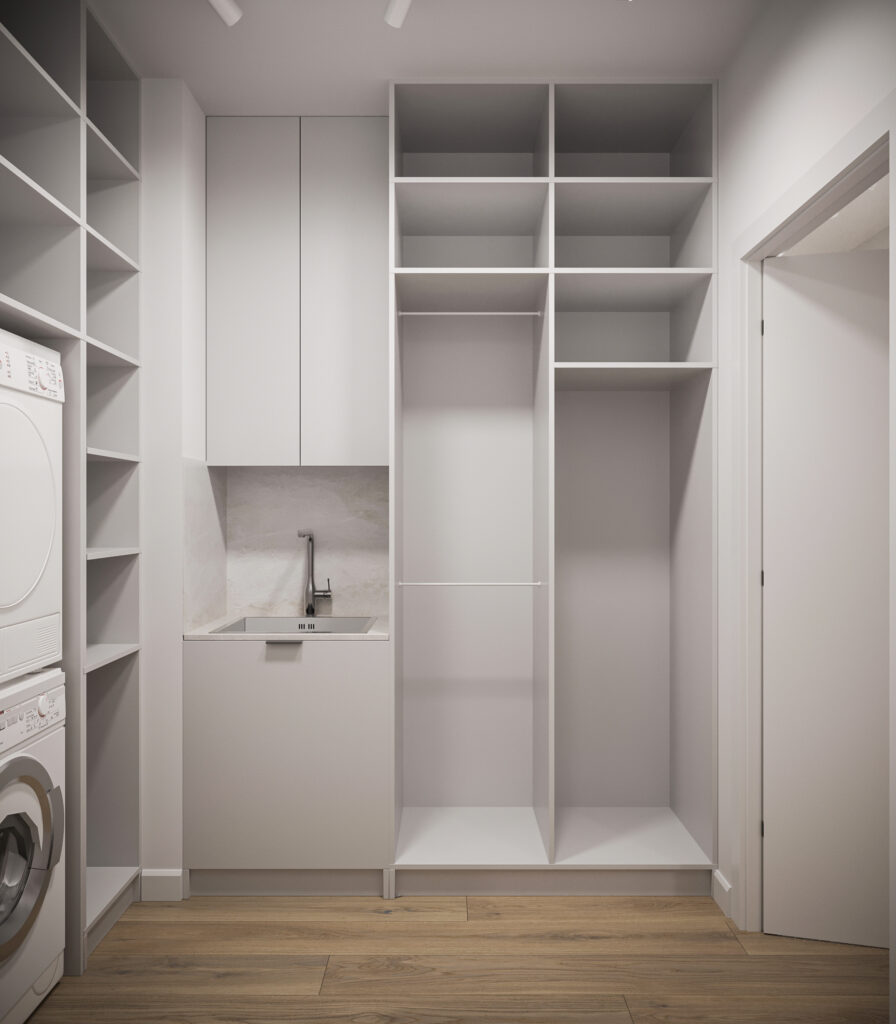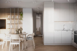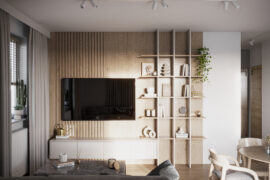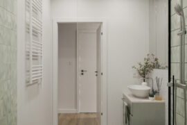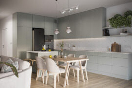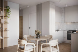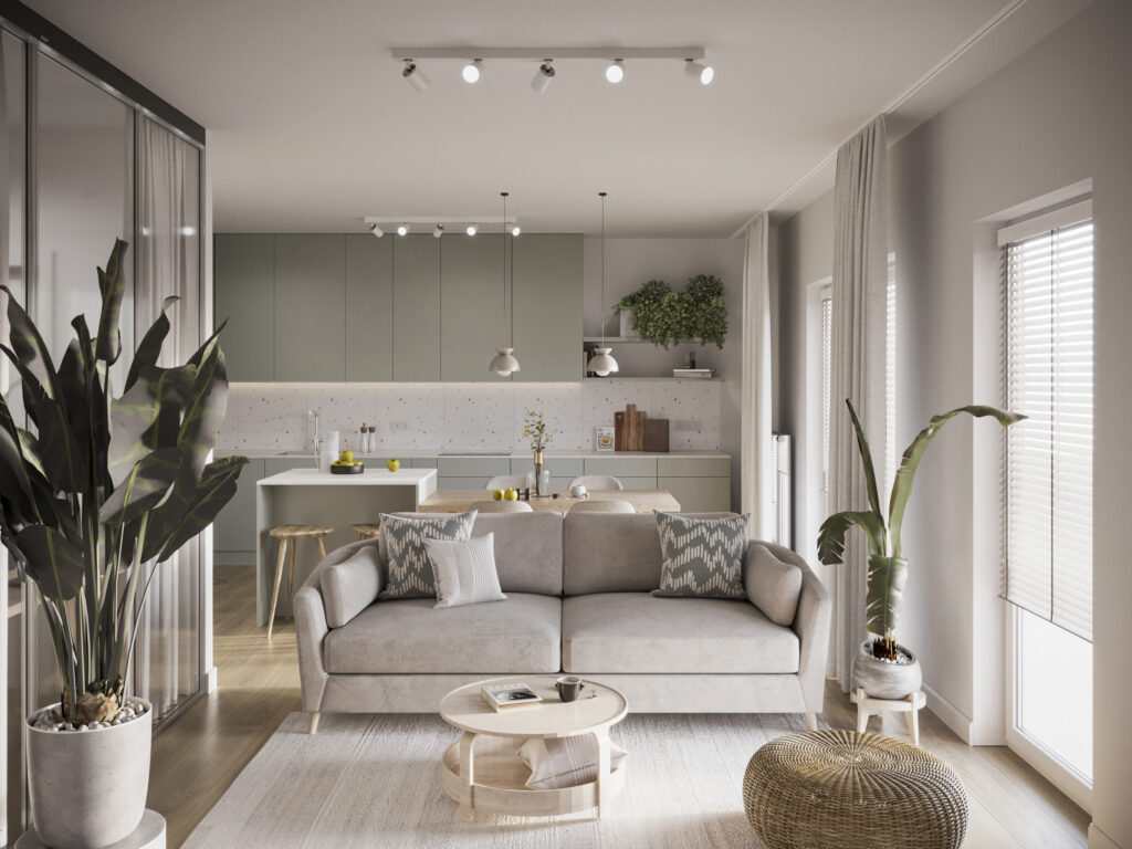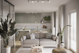 Całościowa aranżacja w nowoczesnym stylu na ulicy Wizjonerów 6 w inwestycji Mieszkaj w Mieście. W tym wnętrzu postawiliśmy na kompleksowy dobór mebli na wymiar, aby projekt był spójny i estetyczny. Elegancka kompozycja trzech kolorów: szarości, pistacji i jasnego drewna sprawia, że pomieszczenia są jasne, ale przy tym przytulne. Na tym tle doskonale można wyeksponować piękne rośliny doniczkowe.