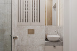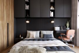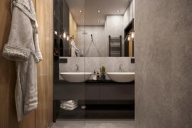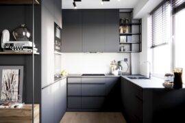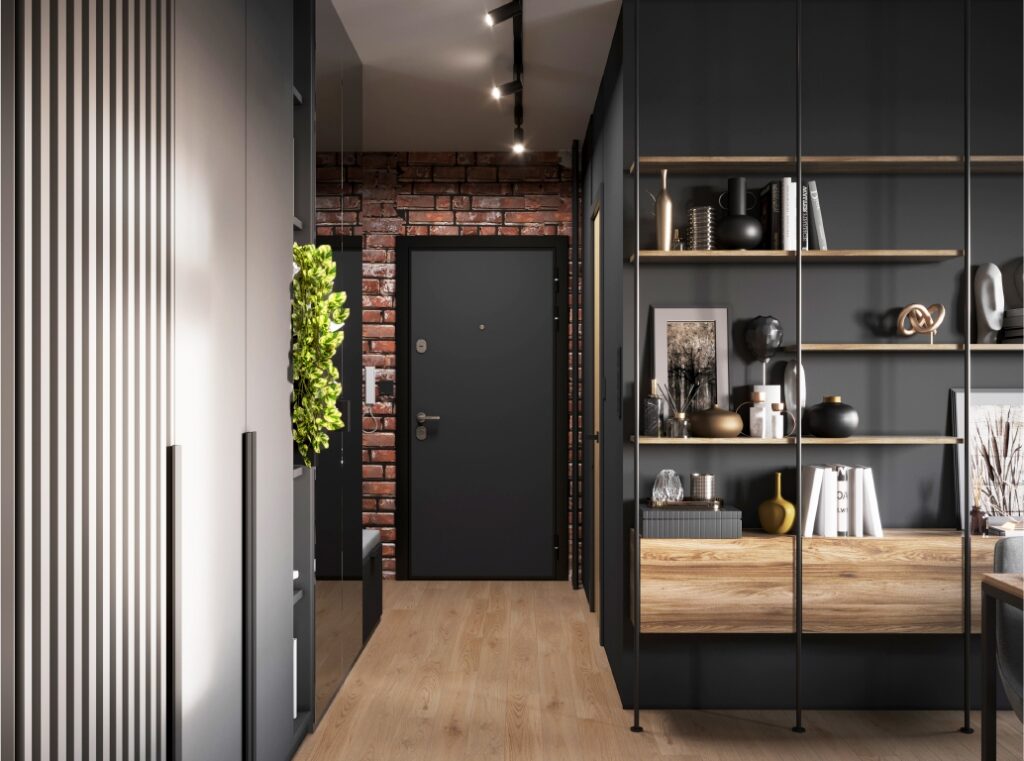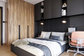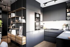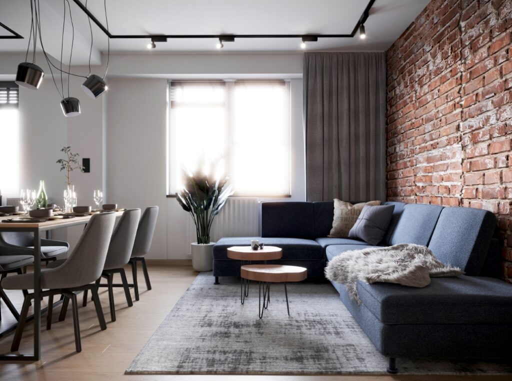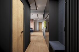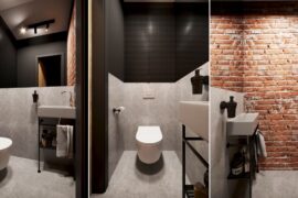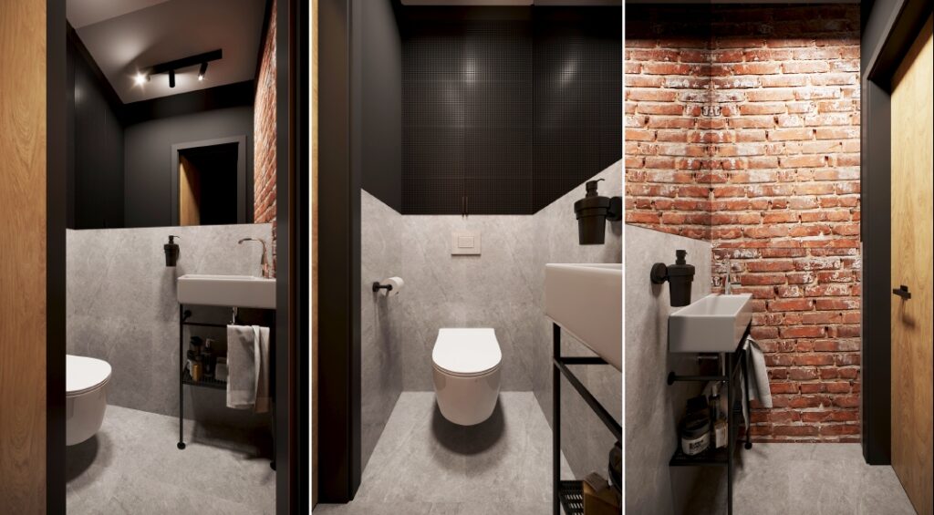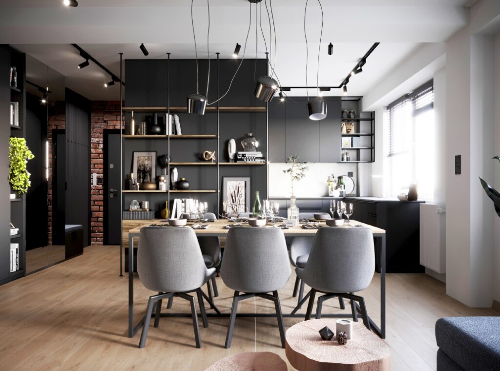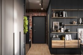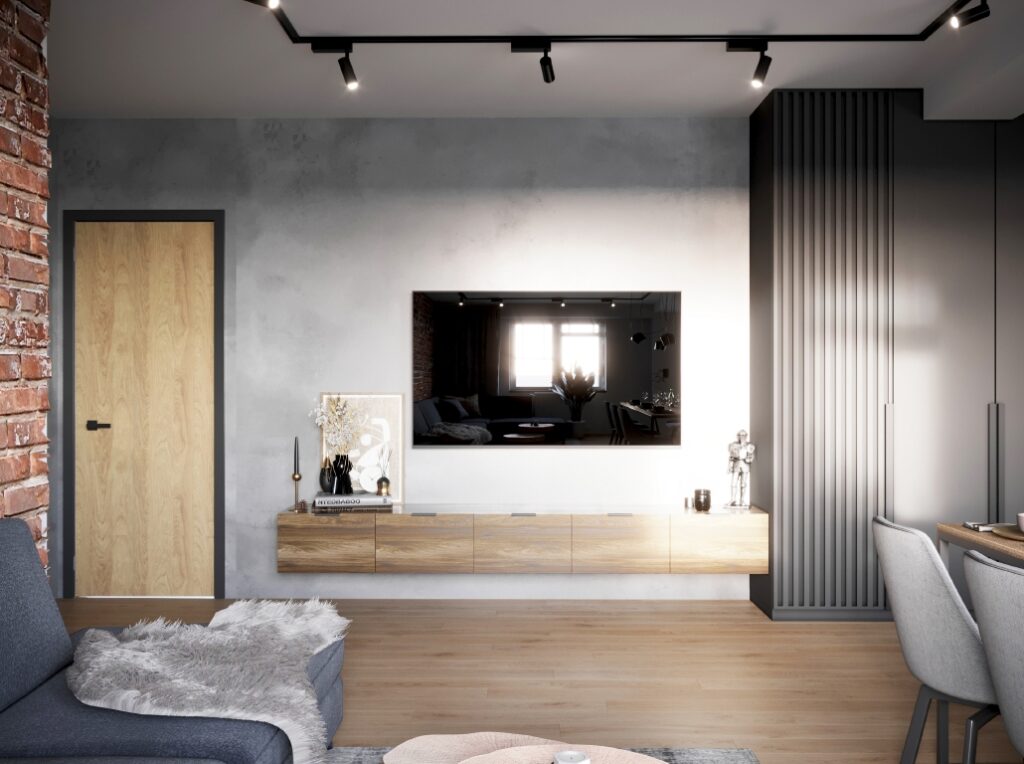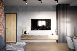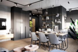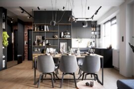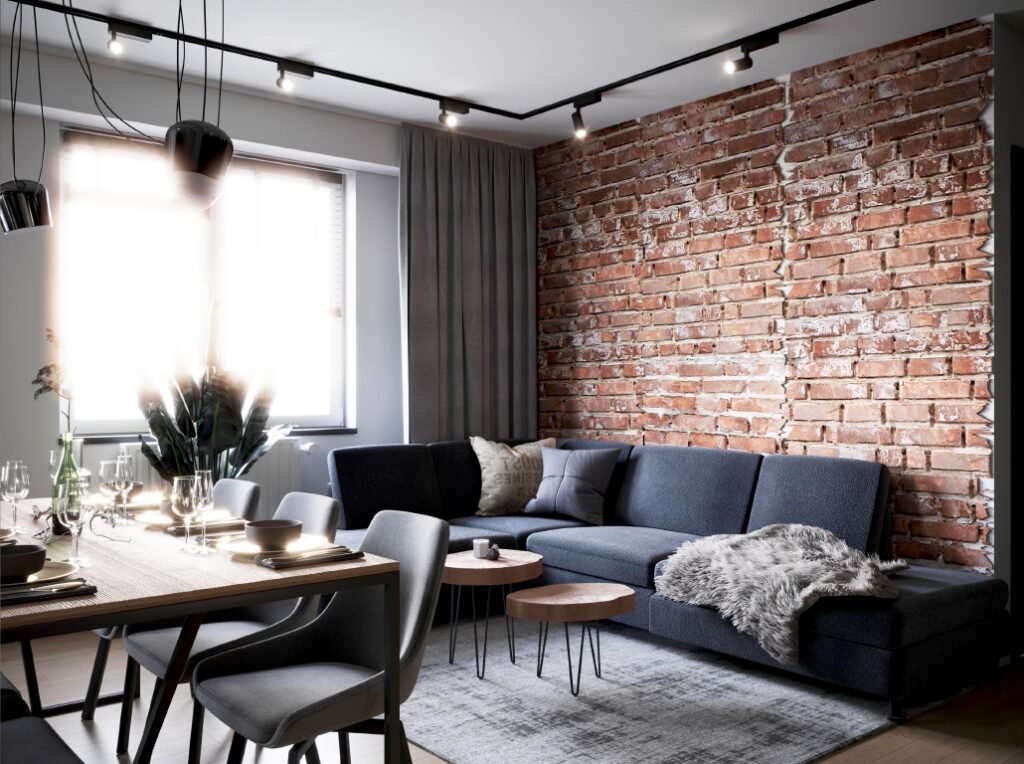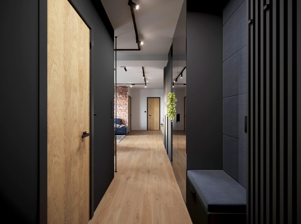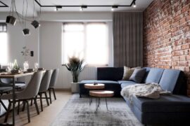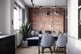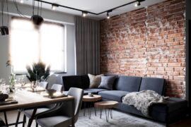 Projekt nowoczesnego mieszkania z elementami stylu industrialnego. Uwagę zwraca zastosowanie cegły i zaproponowanie nietuzinkowych dodatków, które urozmaicą stonowane, przyciemnione wnętrza. Z uwagi na dominację szarości i czerni pamiętaliśmy o zaprojektowaniu odpowiedniego oświetlenia. Całość aranżacji jest spójna i przemyślana. Mamy nadzieję, że przyszli mieszkańcy pokochają to wnętrze!
