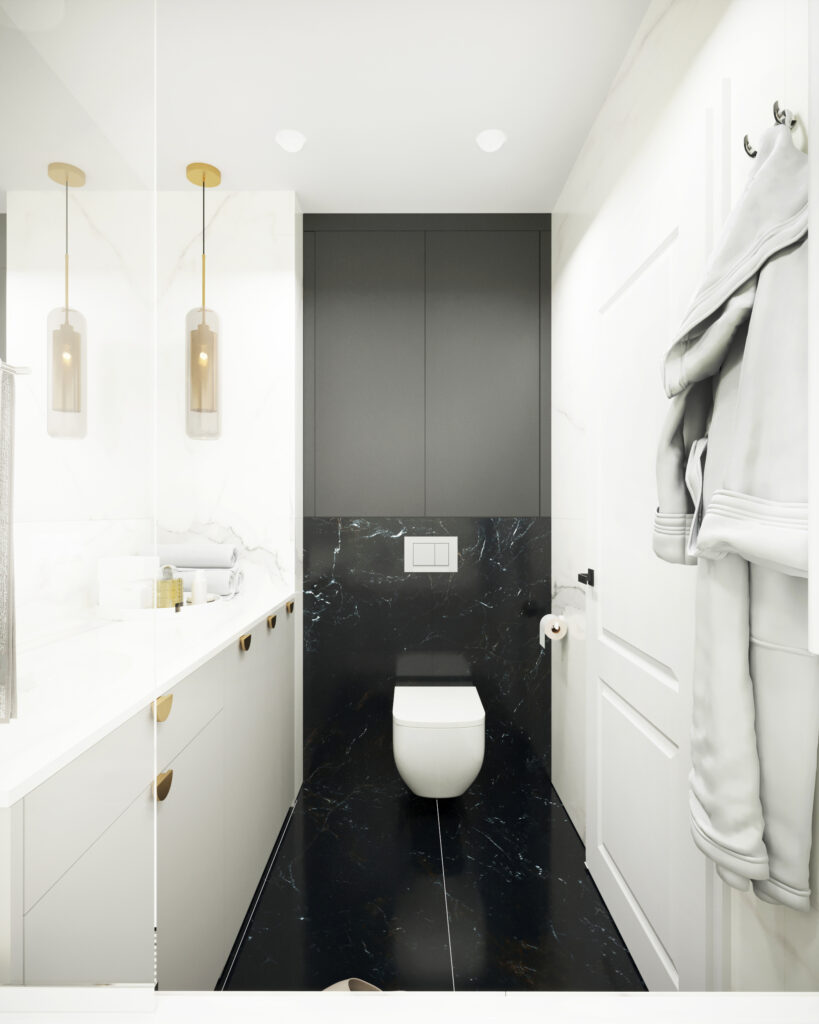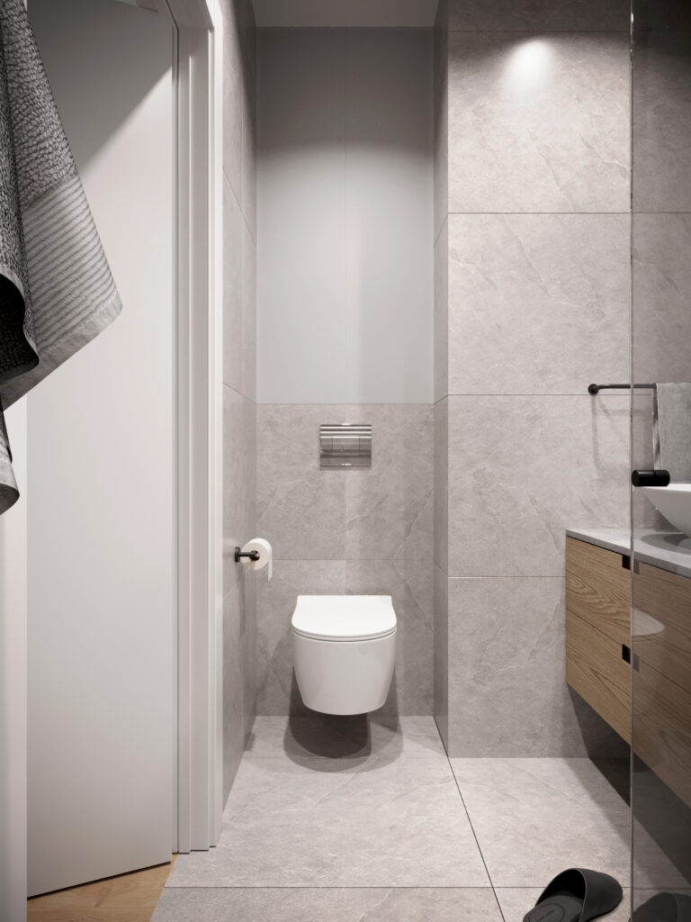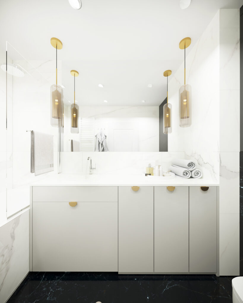 Aranżacja 60-metrowego mieszkania na nowym krakowskim osiedlu. Dzięki przemyślanemu doborowi barw i mebli oraz elementów wyposażenia udało nam się osiągnąć efekt przestronności i elegancji. Zaprojektowaliśmy jasną kuchnię z meblami w kształcie litery L, otwarty salon, a także wygodną sypialnię i piękną łazienkę w dwóch odcieniach marmuru.