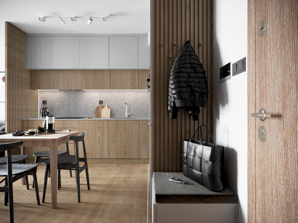 Ta wizualizacja została przygotowana dla mieszkania na krakowskim Zabłociu. Klimatyczna aranżacja, wykorzystująca piękne, głębokie kolory ziemi, nawiązuje do natury. Dzięki temu nawet w środku miejskiej dżungli poczujecie się jak u siebie. Zaproponowaliśmy wysokiej jakości materiały wykończeniowe znanych firm.