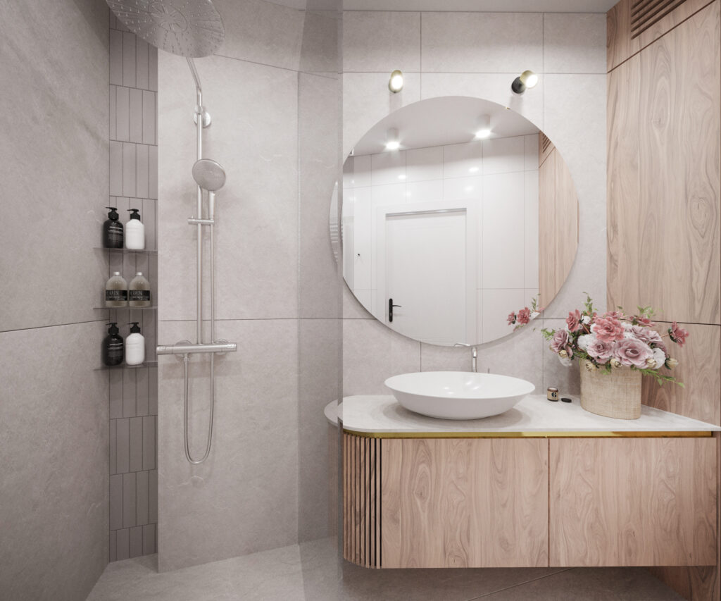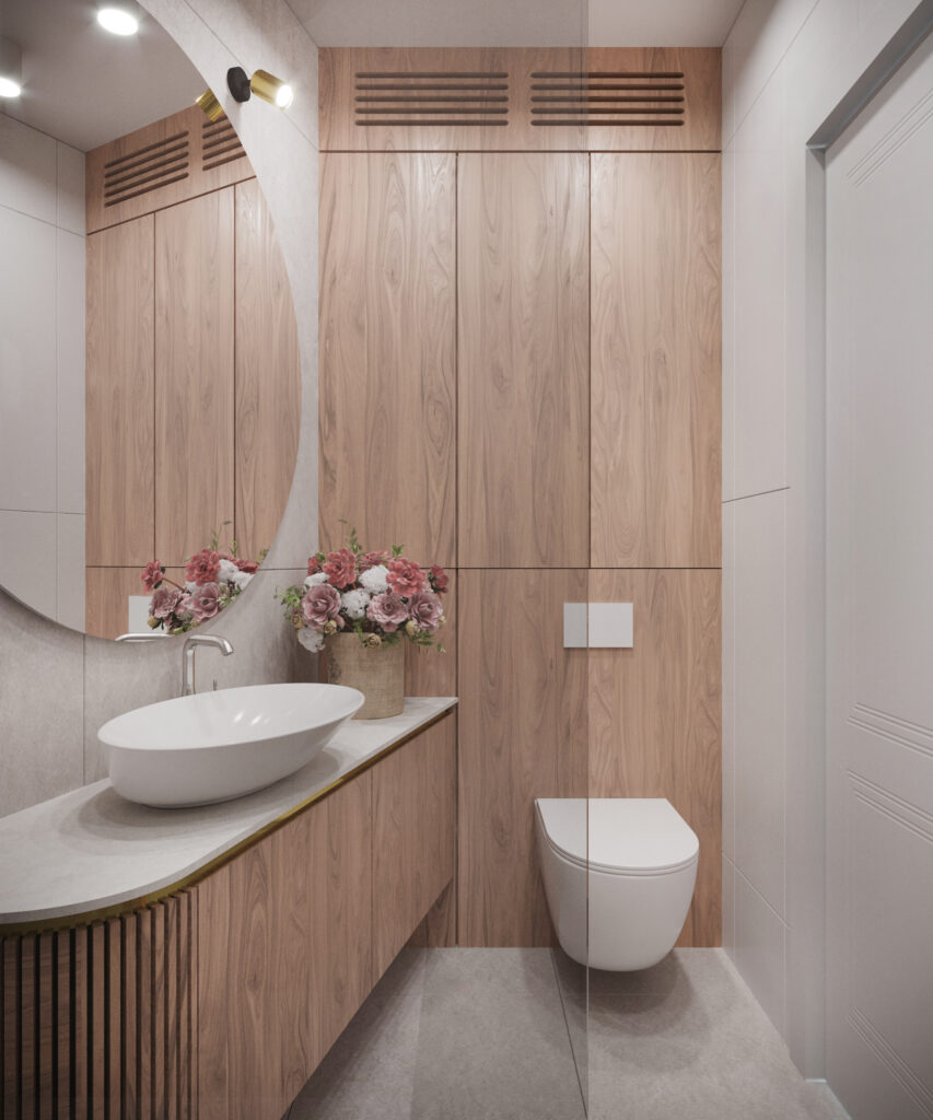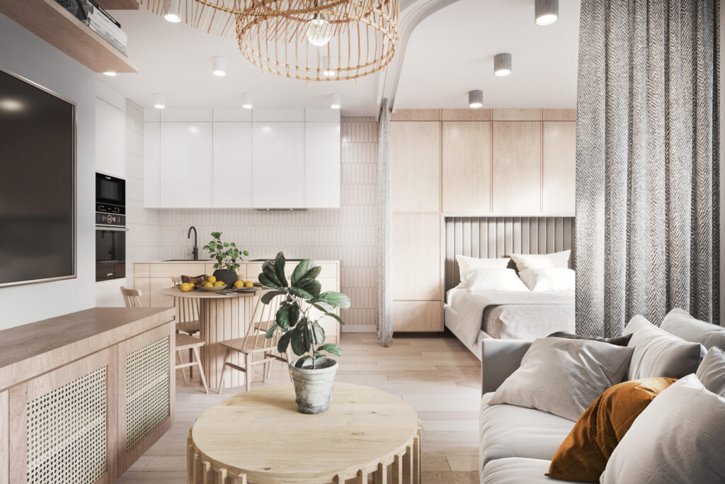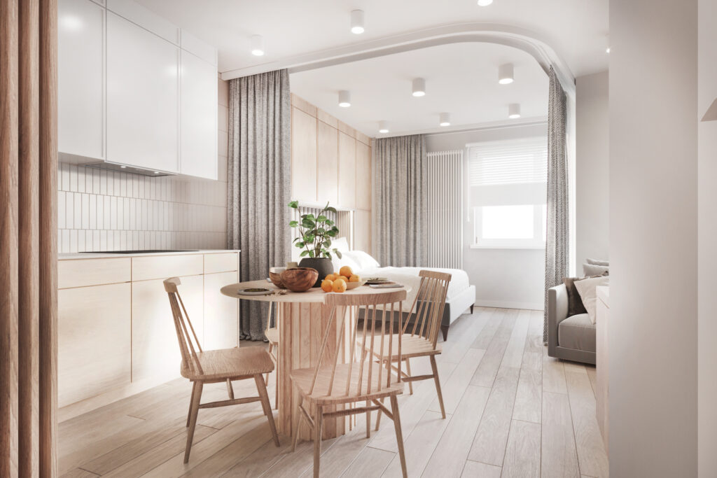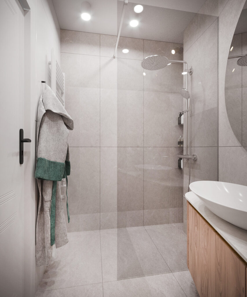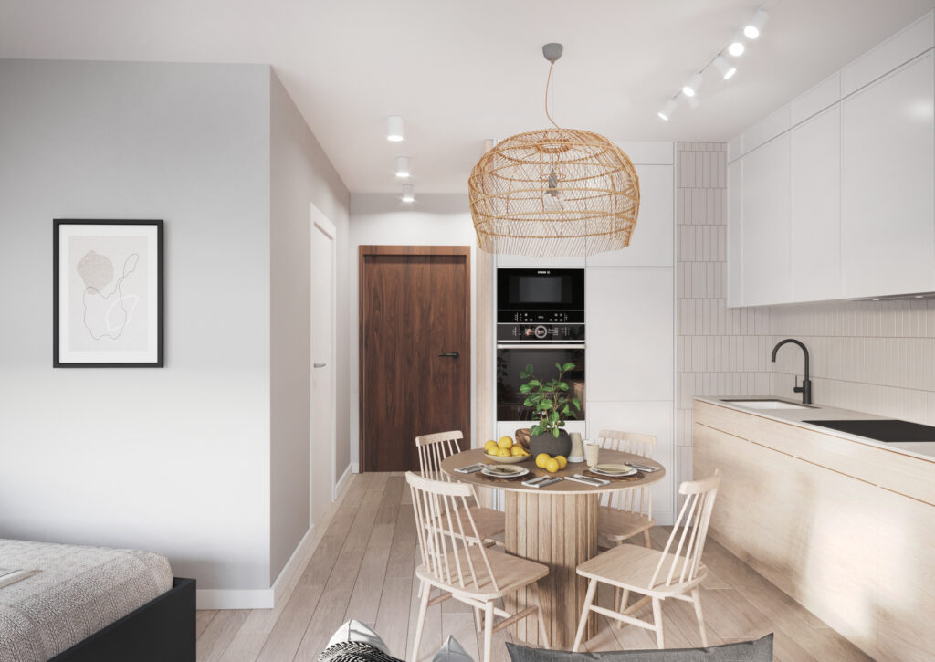 Nasz niezawodny sposób na urządzanie niewielkich mieszkań: czytelne wydzielenie stref i spójność aranżacji całości. W tej propozycji w obu wersjach postawiliśmy na nowoczesne wnętrze i naturalne, jasne kolory. Dobraliśmy okrągłe dodatki: wiklinową lampę nad stołem, okrągły stół na grubej nodze, duże, okrągłe lustro podświetlone od góry kinkietami i okrągłą, nablatową umywalkę. W drugim wariancie zaproponowaliśmy ciekawe rozwiązanie z tymczasowym wydzieleniem przestrzeni za pomocą grubej kurtyny na szynie.