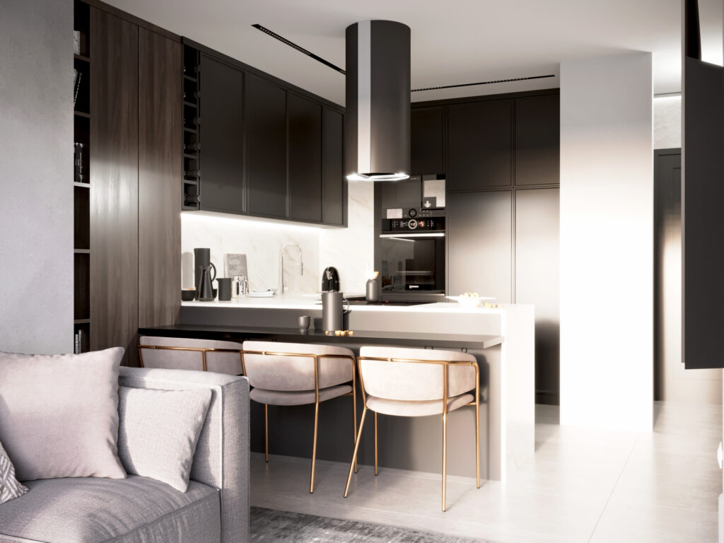 Niewielkie, ale zaprojektowane w najdrobniejszym detalu, monochromatyczne biało-czarne mieszkanie. Taka kolorystyka daje ciekawe możliwości zabawy kontrastem, a z drugiej strony różnymi odcieniami szarości, która nadal nie wychodzi z mody. To świetna propozycja dla tych, którzy chcą postawić na ponadczasową aranżację, ale także dla tych, których gust nie jest jeszcze skonkretyzowany i chcą mieć dobrą bazę, aby potem upiększać swoje mieszkanie.
