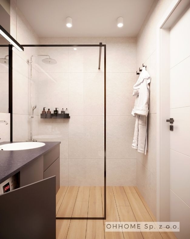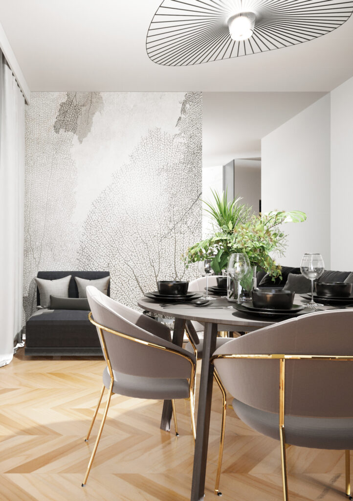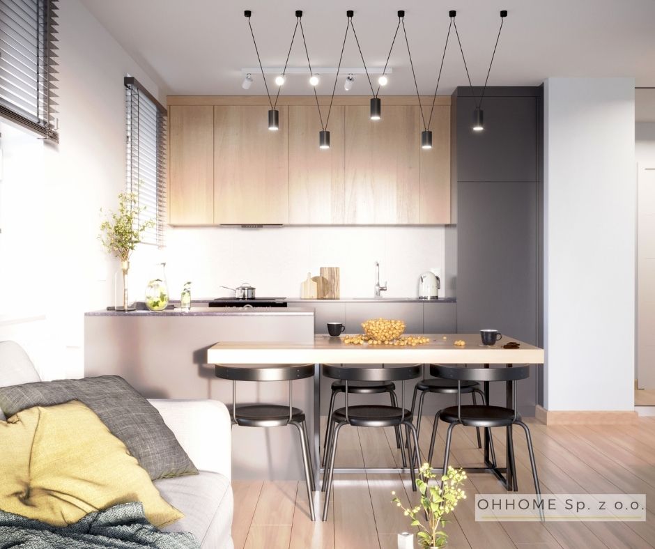 Nasza kolejna realizacja to elegancki apartament w Krakowie. Przygotowaliśmy nowoczesną stylizację z lekką nutką glamour. W pomieszczeniach dominują naturalne kolory, a główną rolę grają piękne, nowoczesne dodatki, jak duża wisząca lampa czy krzesła ze złotymi nogami. W łazience zaproponowaliśmy zaś meble w odcieniu czekolady.