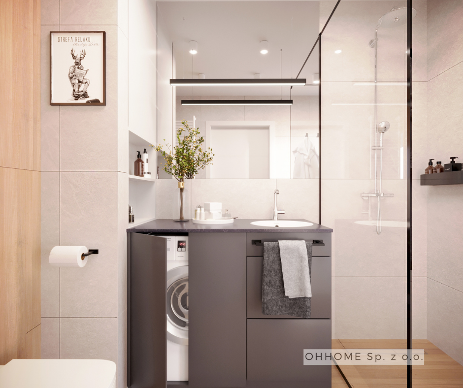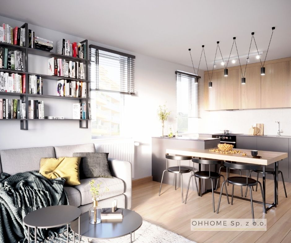 W tej nowoczesnej aranżacji odnajdziemy elementy stylu skandynawskiego, ale też inspirację industrie. Zadbaliśmy o miejsce do biesiadowania z przyjaciółmi, o wygodne półki na książki w zasięgu ręki, o przytulną sypialnię, a także o funkcjonalną łazienkę z zabudowaną pralką. Wnętrza są jasne, nieprzeładowane i spójne stylistycznie. Na zdjęciach prezentujemy dwie wersje kolorystyczne mieszkania.