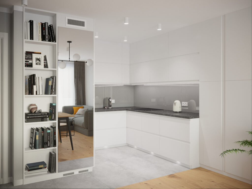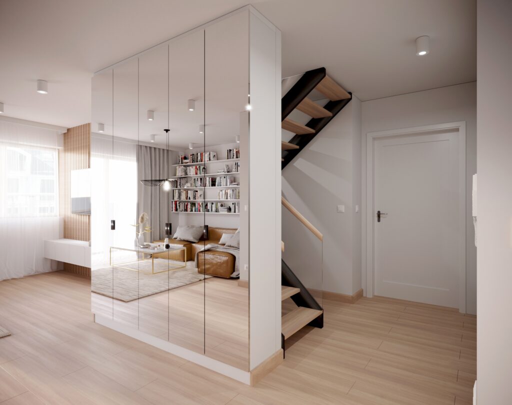 Projekt mieszkania w stylu skandynawskim. Zaaranżowaliśmy proste, ale niezwykle funkcjonalne pomieszczenia z użyciem nowoczesnych rozwiązań. W takich niewielkich przestrzeniach najlepiej widać, jakie korzyści dają indywidualnie zaprojektowane meble na wymiar.