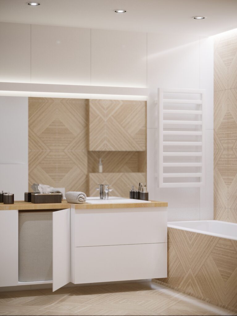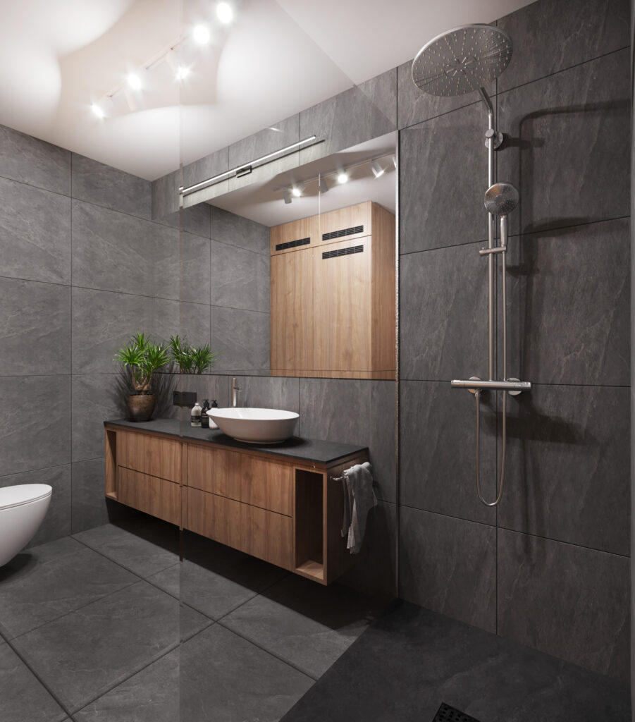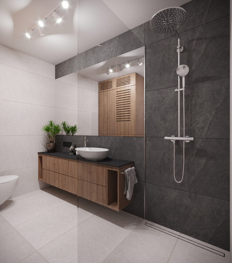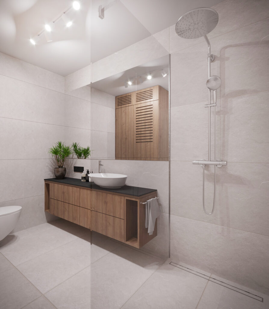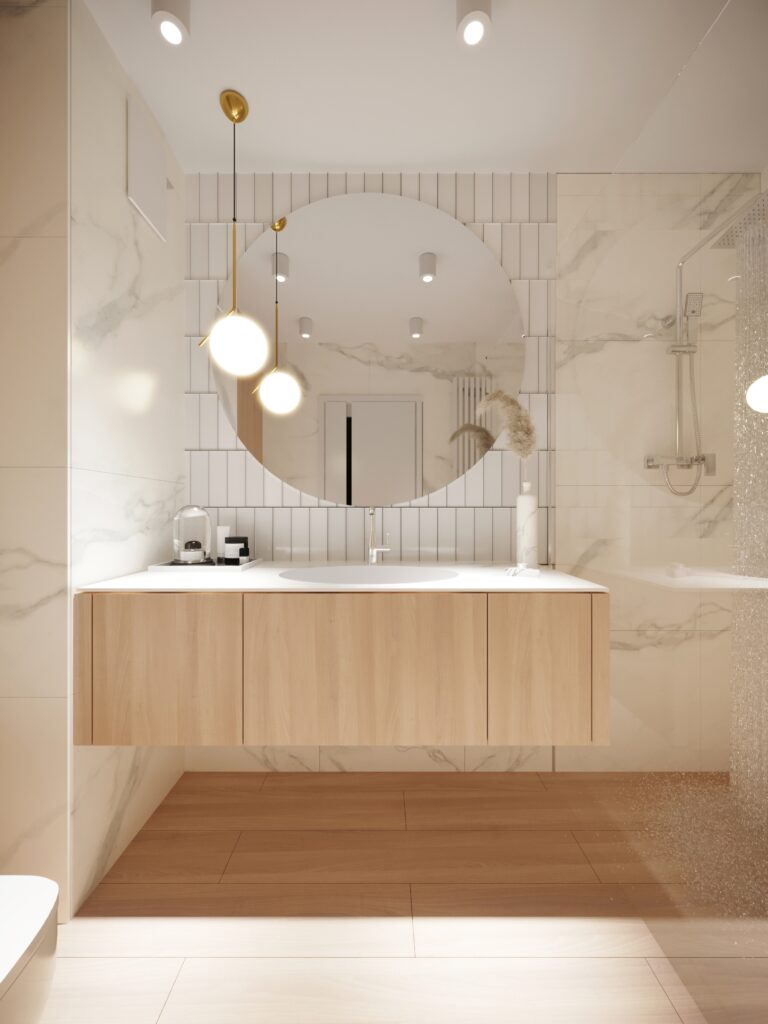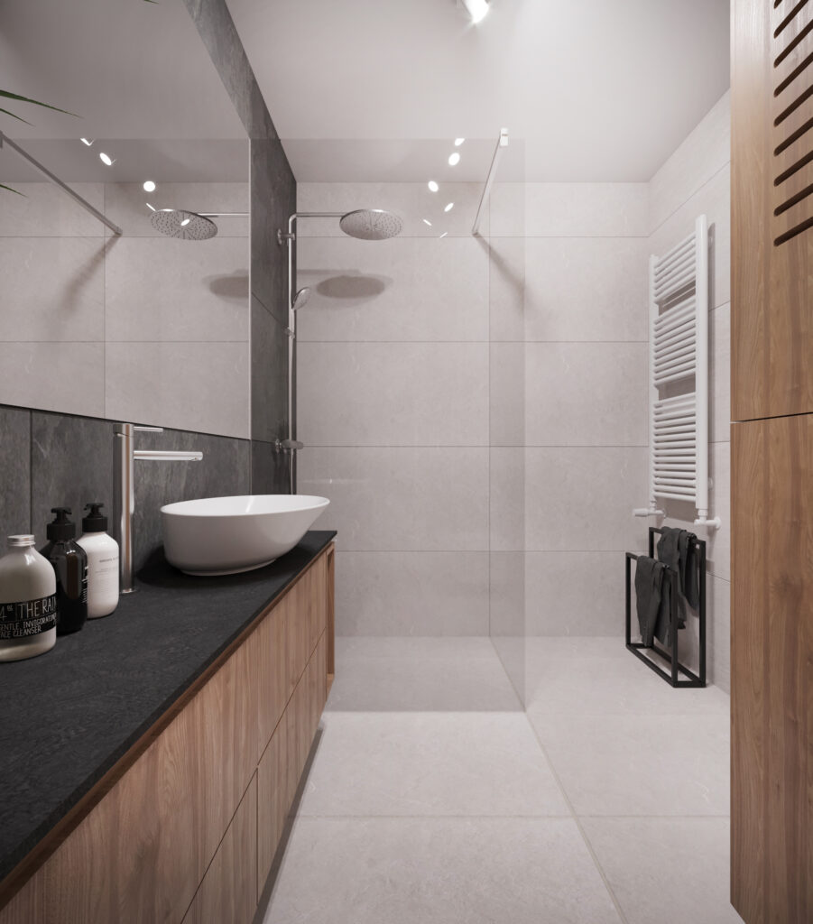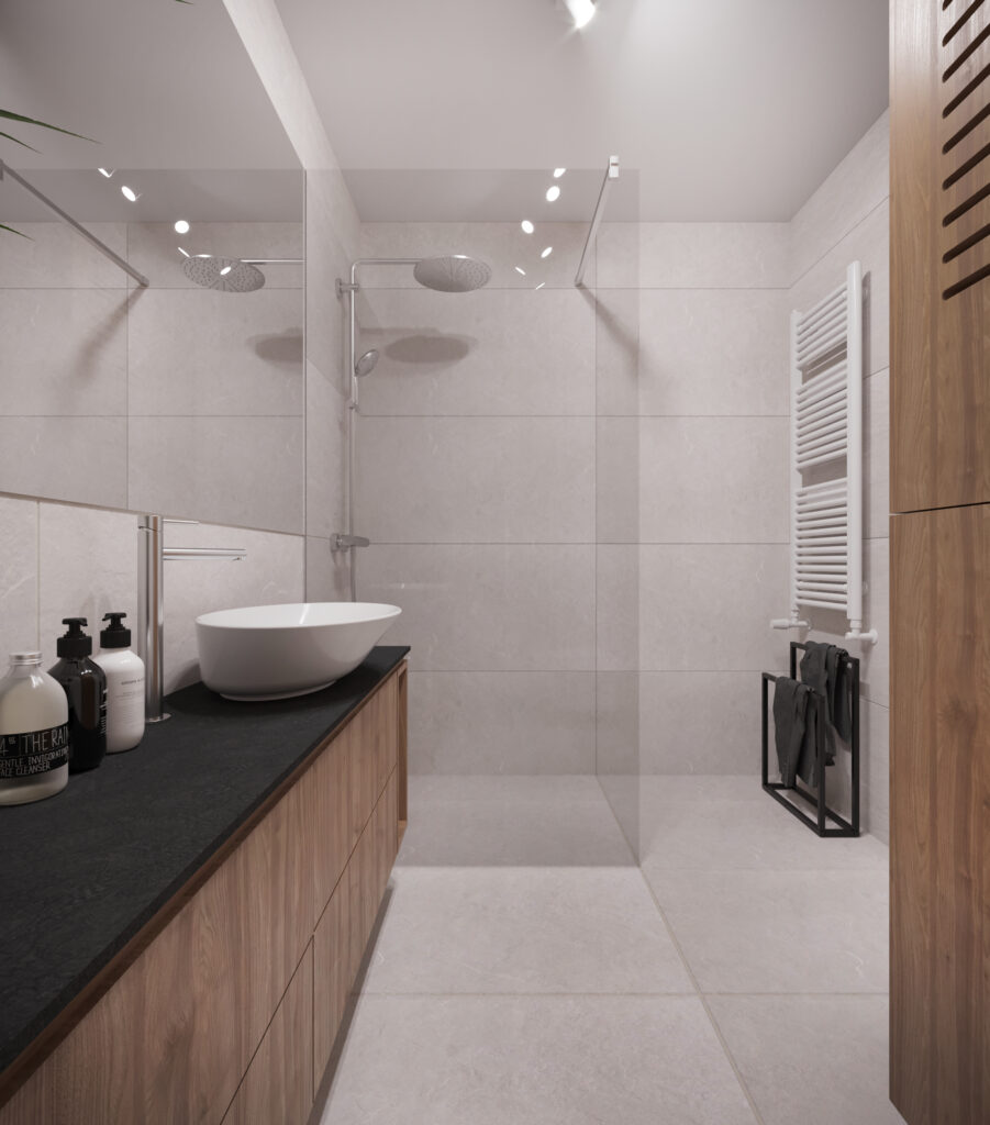 Przygotowane przez nas dla inwestorów trzy odmienne wersje głównej łazienki w dwupoziomowym apartamencie. Dzięki wizualizacjom łatwiej jest wybrać najbardziej odpowiadającą nam wersję kolorystyczną danego pomieszczenia, a także dokonać niezbędnych poprawek jeszcze przed rozpoczęciem realizacji inwestycji. Używane przez nas nowoczesne narzędzia sprawiają, że wizualizacje bardzo dobrze odwzorowują docelowy wygląd mieszkania.