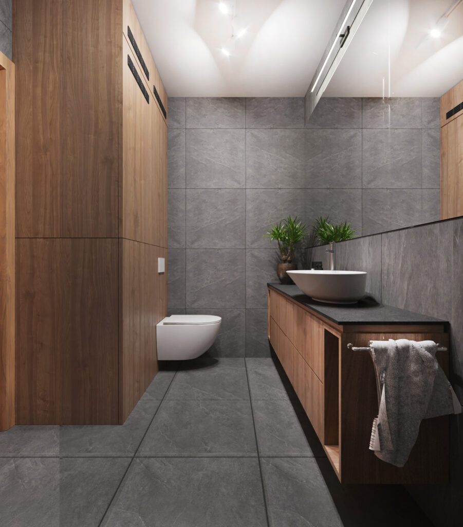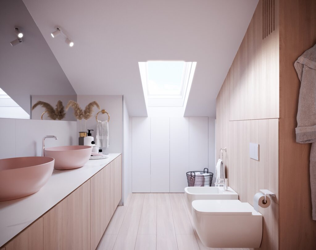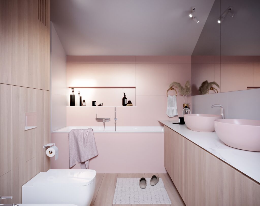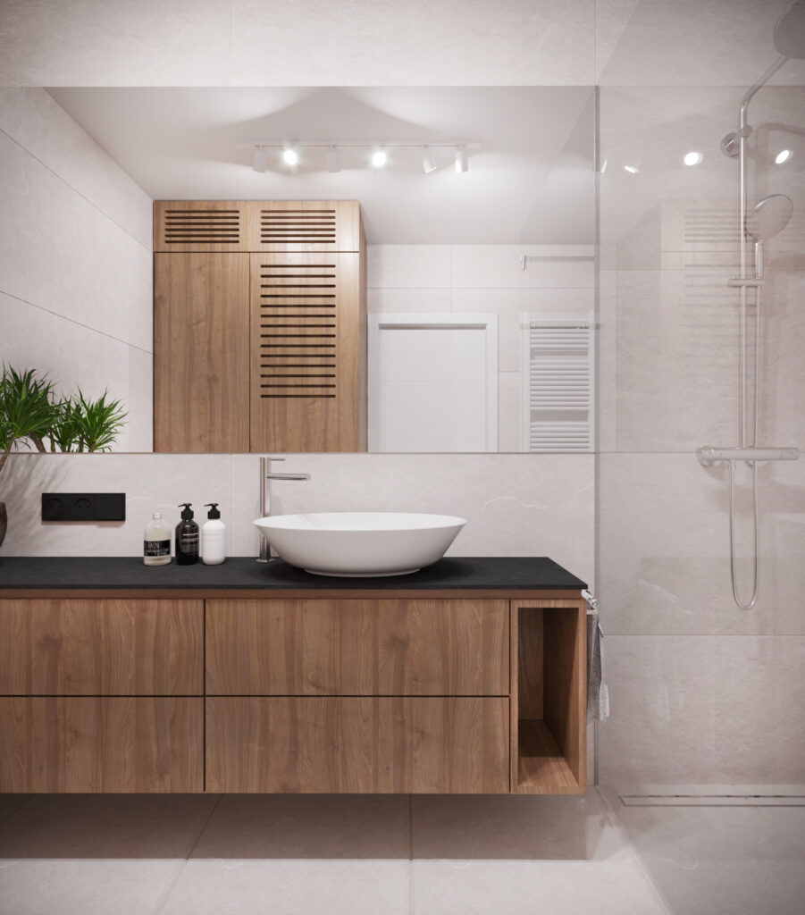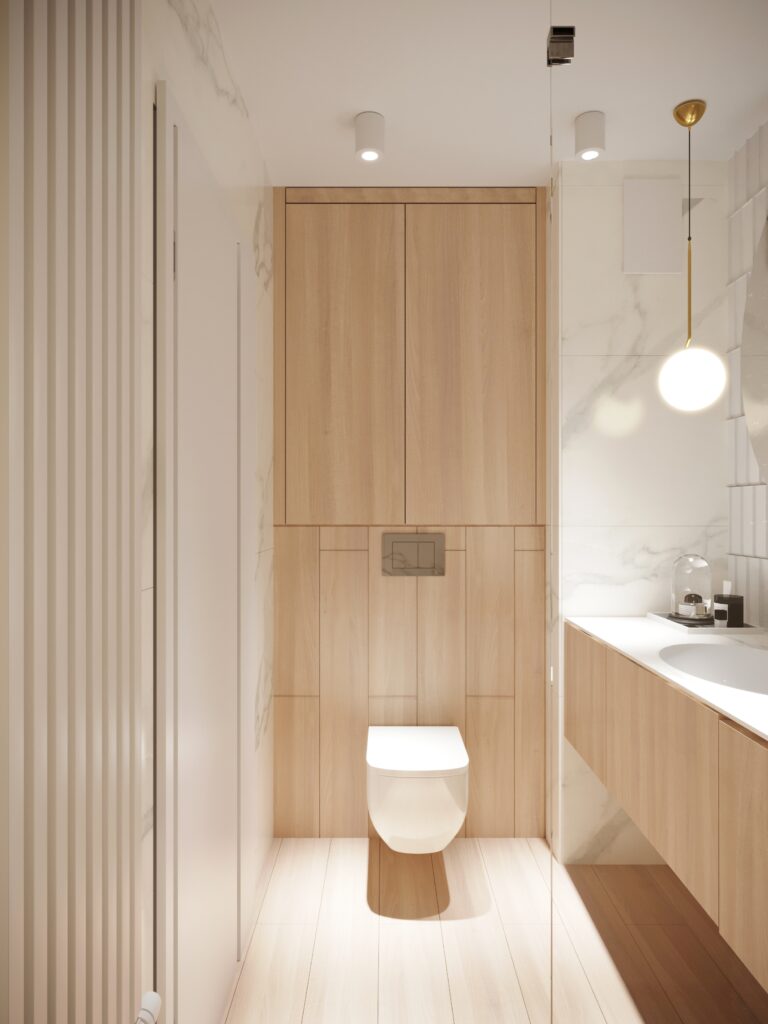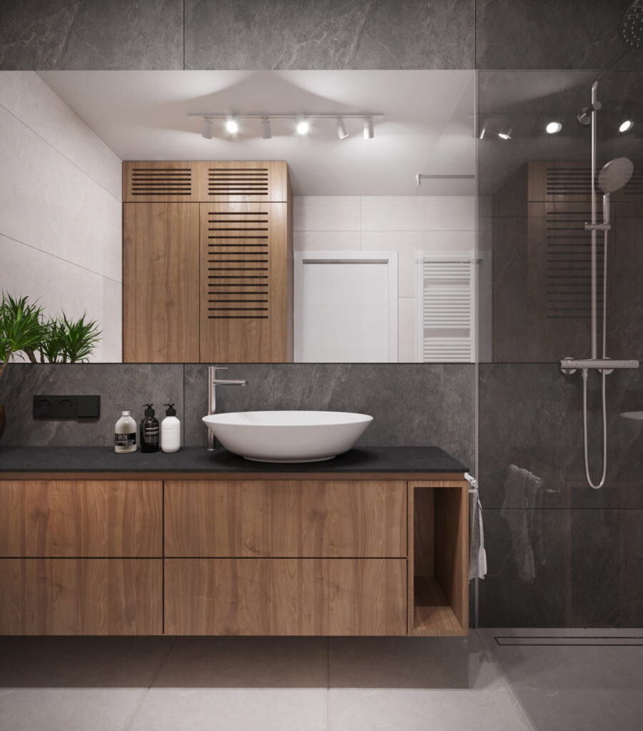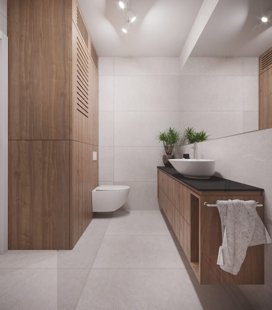 Przygotowane przez nas dla inwestorów trzy odmienne wersje głównej łazienki w dwupoziomowym apartamencie. Dzięki wizualizacjom łatwiej jest wybrać najbardziej odpowiadającą nam wersję kolorystyczną danego pomieszczenia, a także dokonać niezbędnych poprawek jeszcze przed rozpoczęciem realizacji inwestycji. Używane przez nas nowoczesne narzędzia sprawiają, że wizualizacje bardzo dobrze odwzorowują docelowy wygląd mieszkania.