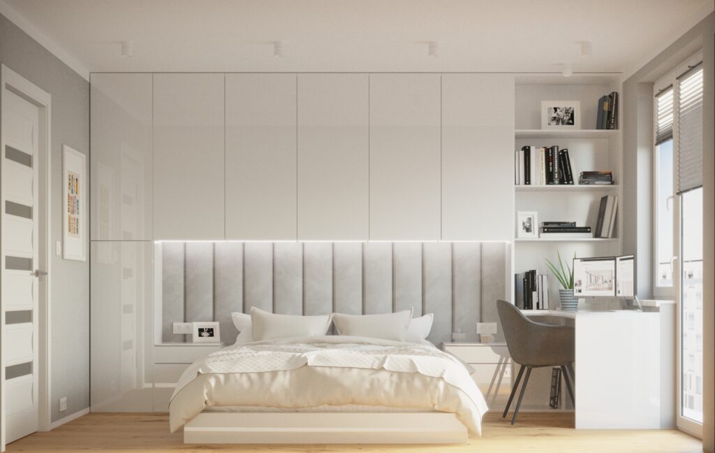 Kompleksowy projekt wnętrza mieszkania o powierzchni 120 m2. Na tej przestrzeni zaaranżowaliśmy wnętrza pełniące różne funkcje, ale zwróciliśmy szczególną uwagę na spójność estetyczną całego projektu. W efekcie uzyskaliśmy piękne, nowoczesne aranżacje z delikatną nutką glamour. Na uwagę zasługują opracowane przez nas ciekawe elementy zabudowy meblowej na wymiar w salonie i w sypialni.